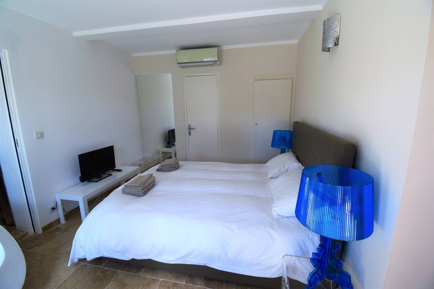 Une magnifique vue mer sur St Tropez depuis la très jolie chambre de maître.