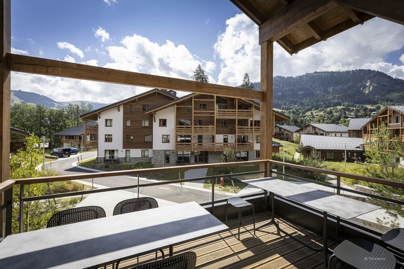Depuis la terrasse, le regard s’ouvre sur un panorama alpin d’une rare élégance, où les chalets de bois dialoguent harmonieusement avec les reliefs verdoyants.